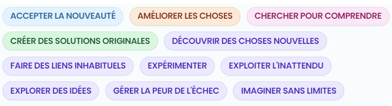 Des compétences pour innover, sortir des sentiers battus, et accepter l’incertitude. Qu’il s’agisse d’imaginer sans limites, d’expérimenter ou de prendre des risques calculés, ces compétences çpermettent de transformer les idées nouvelles en solutions originales et impactantes.