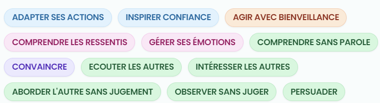 Développez des compétences pour comprendre, écouter et inspirer confiance. Que ce soit pour adapter vos actions ou gérer les émotions, ces compétences sont cruciales pour établir des interactions efficaces et empathiques dans tous les contextes.